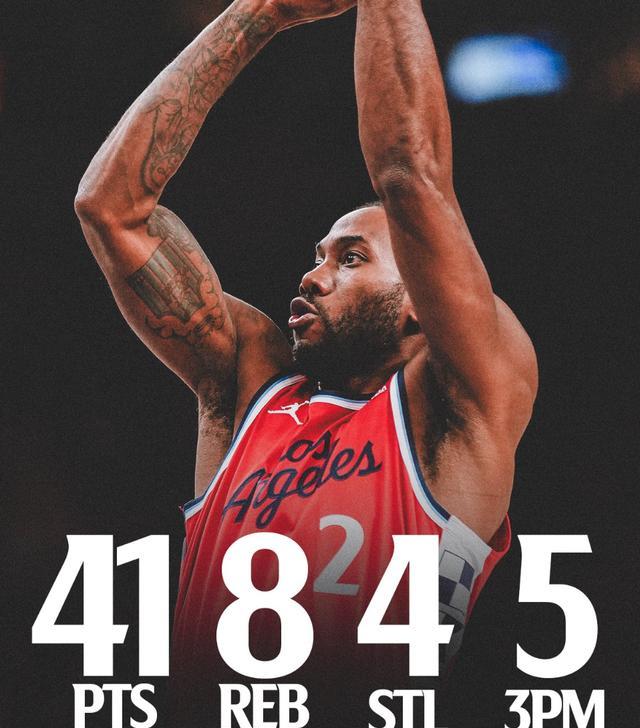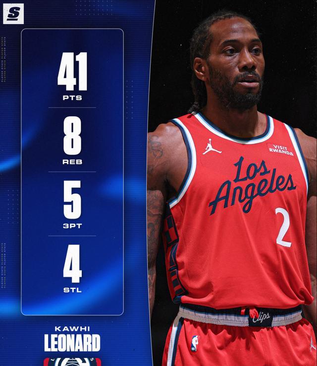 伦纳德这场比赛34分钟,30中14,三分11中5,罚球10中8,拿到41分8篮板2助攻4抢断,命中率46.7%,三分命中率45.5%,真实命中率59.6%,正负值+20。