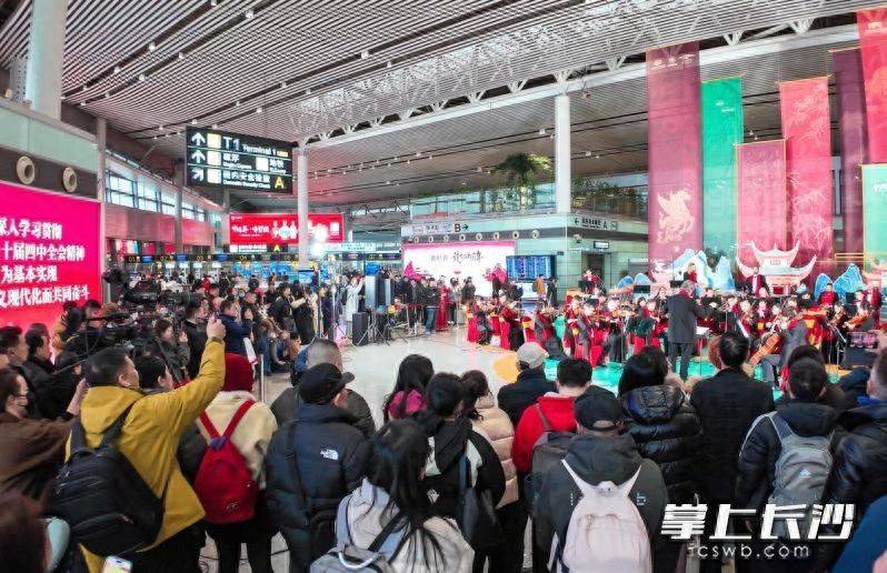 长沙晚报掌上长沙2月7日讯(全媒体记者 陈焕明 通讯员 向紫鸣 吴娟)2月7日下午,长沙黄花国际机场T2航站楼的春运人流中,一座“流动的文化舞台”悄然搭建起来,48名中外演奏家组成的张家界爱乐乐团一登场,《春节序曲》的热烈旋律便瞬间点燃团圆喜庆氛围,行色匆匆的旅客纷纷停下脚步、驻足欣赏,让奔波的旅途多了份艺术暖意。