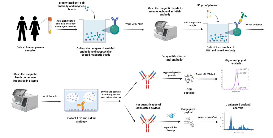 益诺思开发了一种LBA与LC-MS/MS联用的ADC药物生物分析策略,通过链霉亲和素包被的磁珠与生物素化的捕获抗体进行反应,再将血浆中的ADC药物进行特异性免疫捕获(分析策略见图5)。该方法可同步获取总抗、偶联毒素小分子及DAR值,可应用于ADC药物的临床前及临床的PK/PD研究。