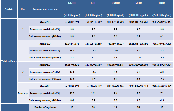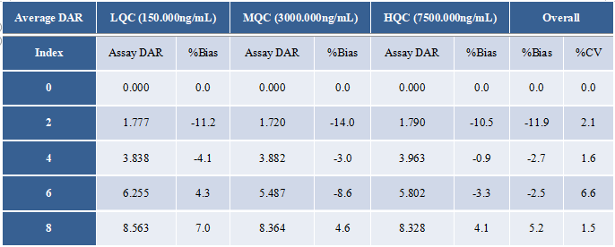 分析方法根据ICH M10指南要求完成了方法学验证,总抗(a)及偶联毒素小分子(b)的标准曲线见图6。准确度精密度结果见表1(总抗)和表2(偶联毒素小分子)。通过比较不同浓度水平的QC样本实测DAR值与理论DAR值的偏差(%Bias)及精密度(%CV),验证了分析方法对平均DAR值检测的准确性,结果见表3所示。