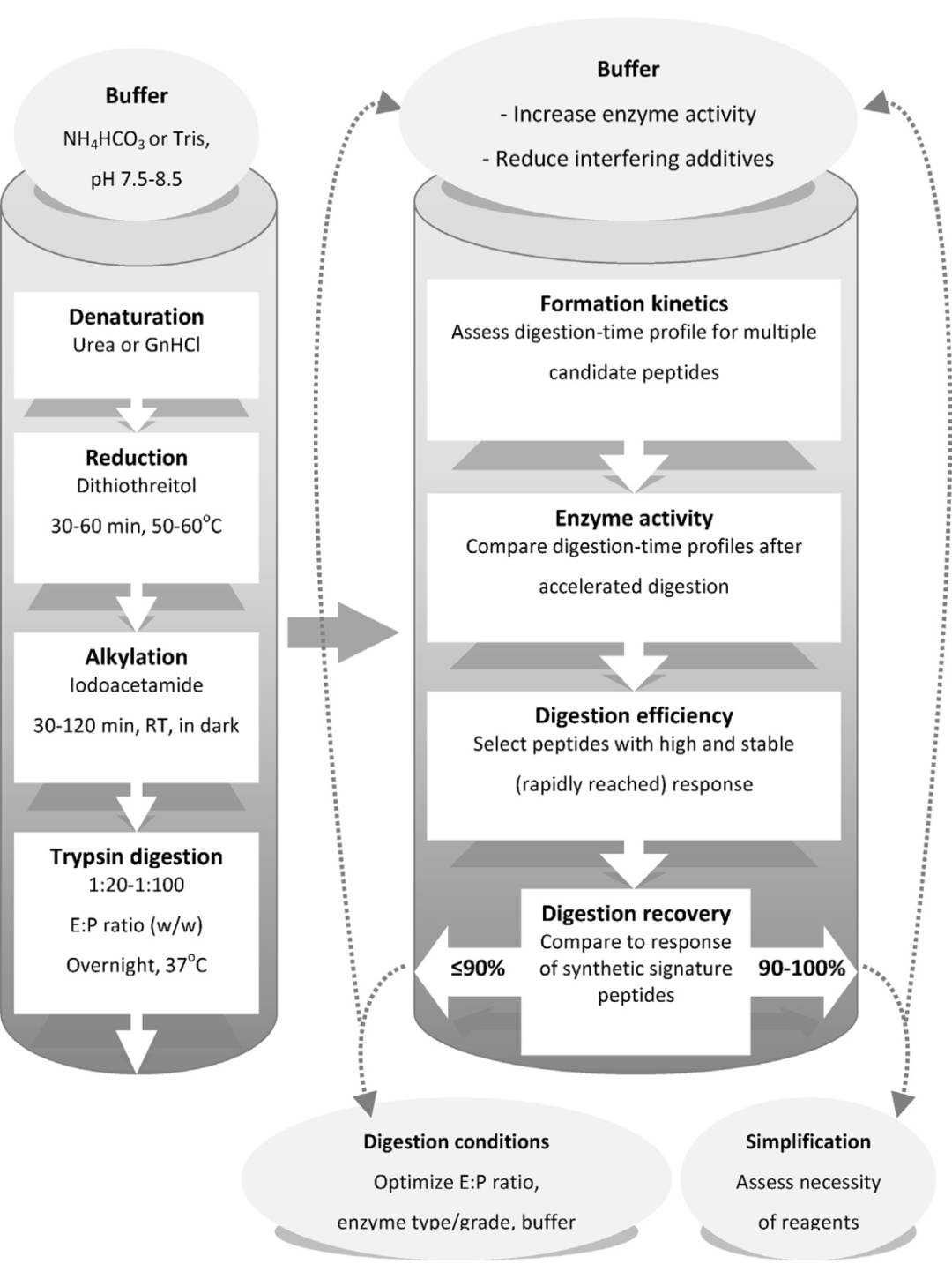 酶解过程通常包括蛋白变性、还原双硫键、烷基化以及酶解反应。其中酶解反应可以选择不同的酶(包括胰蛋白酶、胃蛋白酶、赖氨酰内肽酶、胰凝乳蛋白酶、谷氨酸内肽酶和天冬氨酸内肽酶等[4]),最常用的是胰蛋白酶,它会切割精氨酸和赖氨酸残基的羧基端,从而生成特征的替代肽。酶解条件如温度、pH值和酶解时间等均需要进行优化[5](图4)。