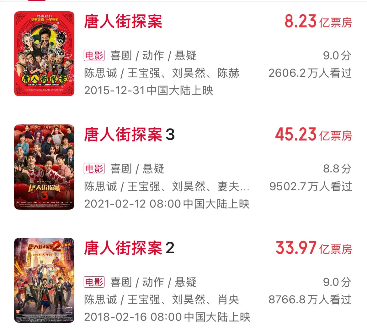 当时陈思诚就承诺“五年内推出”,如今五年之约已到,加上从《唐探2》到《唐探1900》,这个系列每次登陆春节档都没让人失望——《唐探2》拿了33.97亿,《唐探3》狂揽45.23亿,去年的《唐探1900》也默默斩获32亿票房,三次都是春节档亚军,堪称“神作之壁”。