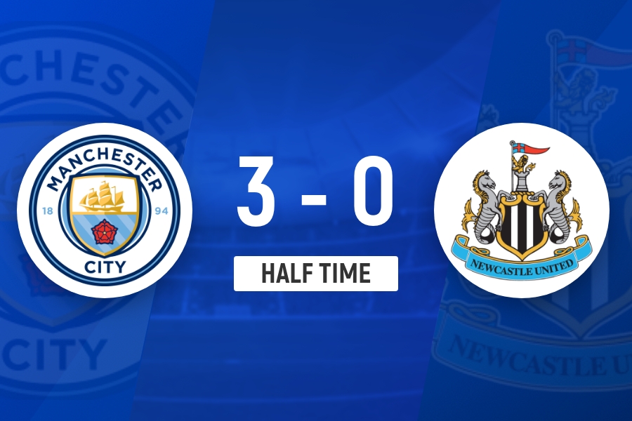 半场结束,曼城暂3-0纽卡斯尔联。