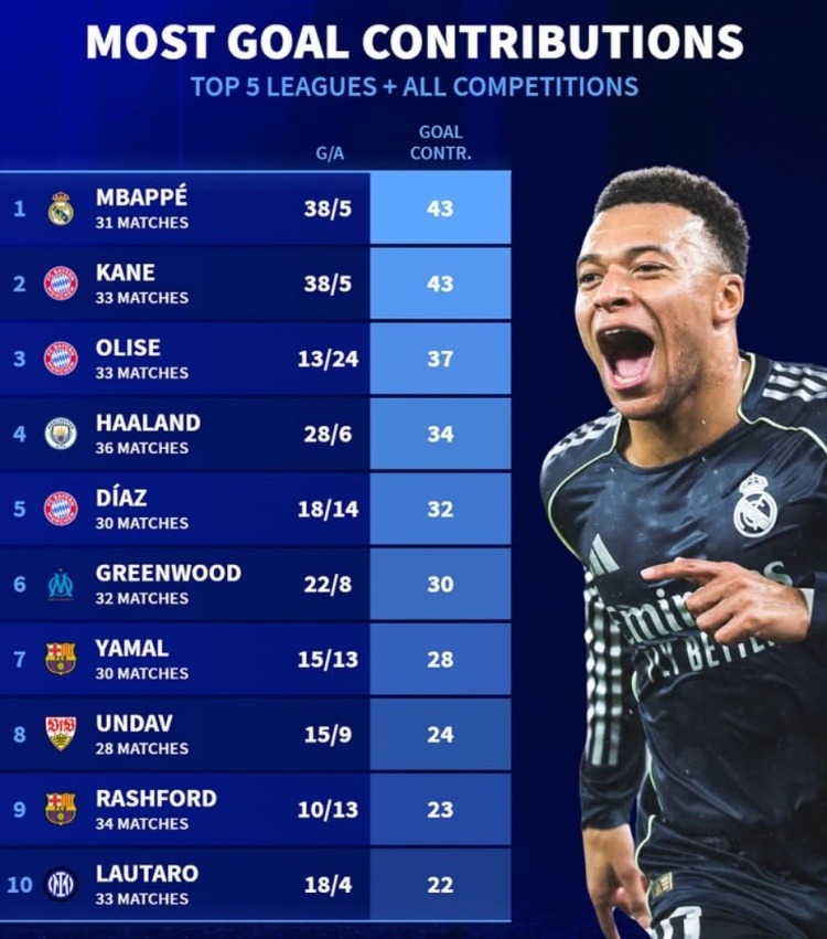 直播吧2月10日讯 《转会市场》也统计了五大联赛球员本赛季各项赛事参与进球情况,姆巴佩和凯恩43球并列最多。