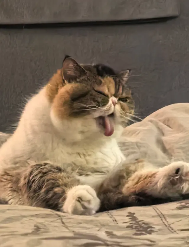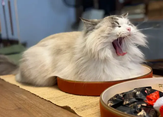 再看刘天池晒出的家中小猫,其中一只布偶猫,正趴在桌上的圆形托盘里打哈欠,姿态慵懒可爱。它拥有蓬松柔软的长毛,毛色以浅灰白为主,面部有淡淡的斑纹,粉嫩的鼻子和长长的胡须十分醒目。